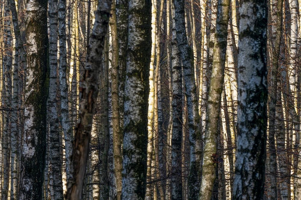 Eine abstrakte Ansicht eines Birkenwäldchens in der Veluwe im Herbst. Abstrakte Naturfotografie.