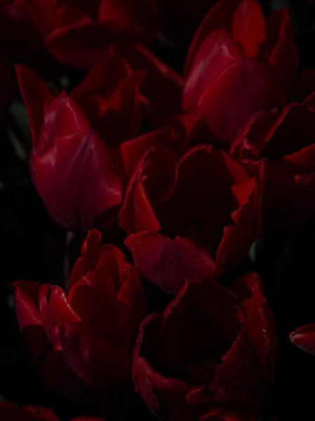 Bestelle dieses abstrakte Wandbild Nahaufnahme: Rote Tulpen in der Sonne von Anke Croonen als Kunstdruck auf Leinwand, Alu-Dibond, als Poster, Fototapete oder Acrylglasbild.