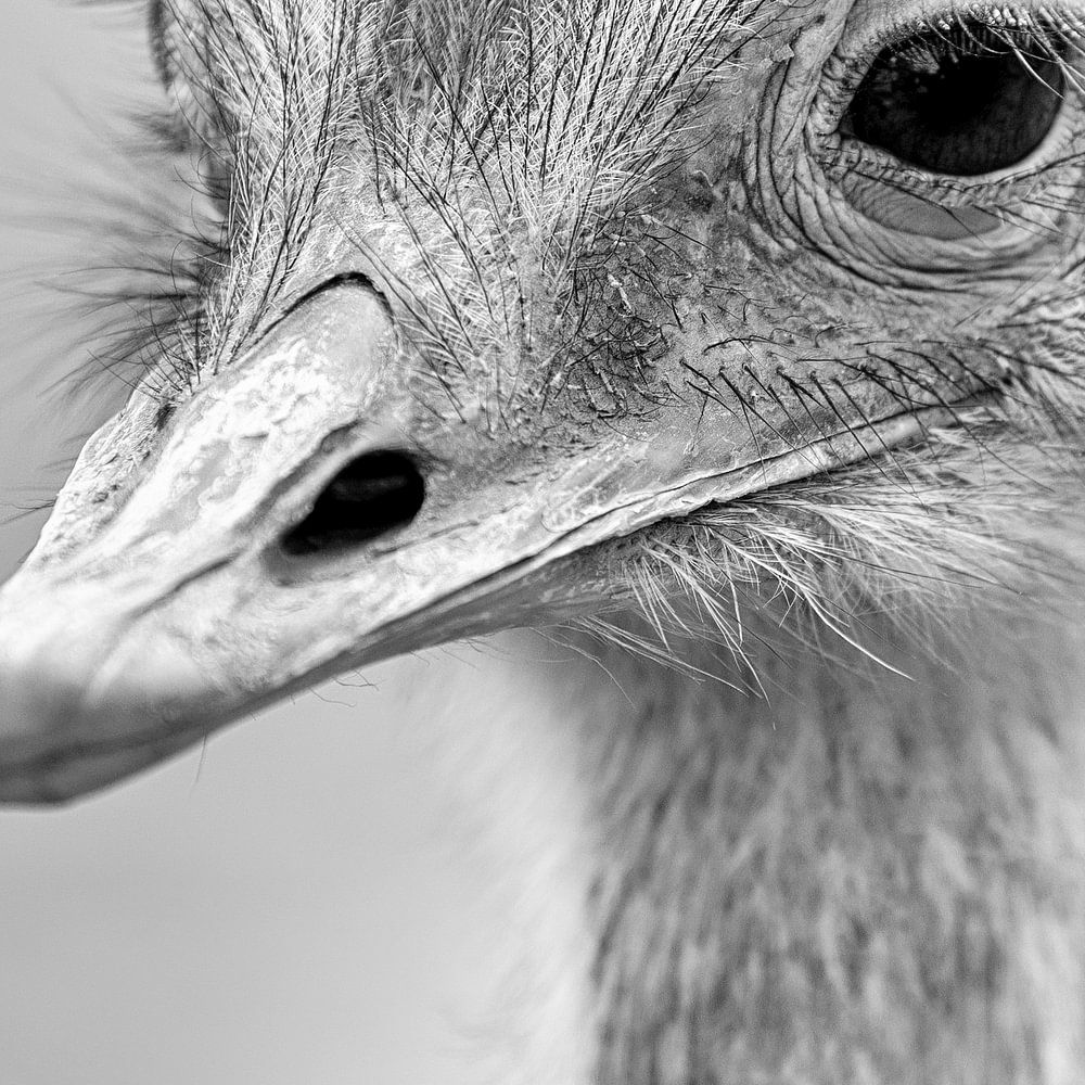 Nahaufnahme eines Darwin's Nandu in schwarz-weiß.