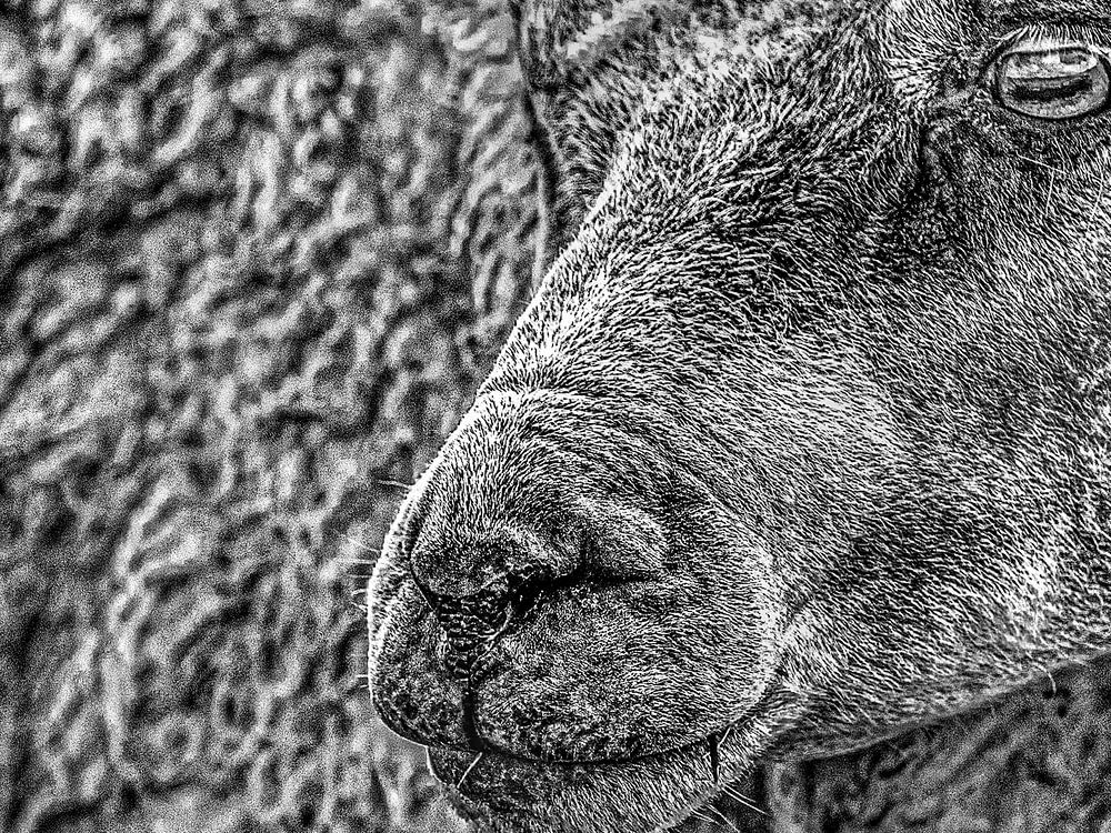Nahaufnahme eines Wollschafs in Schwarz-Weiß, kurz bevor es geschoren wird und ein üppiges Gestrüpp hinterlässt.