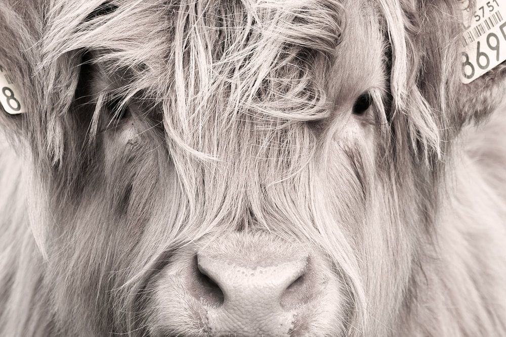Foto eines jungen schottischen Highlanders, leicht bearbeitet. Dies macht das Foto leicht in verschiedenen Interieurs passen. Das Foto wurde im November 2023 in Drenthe aufgenommen.