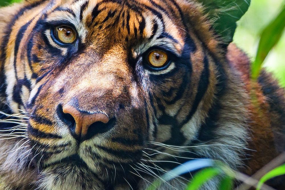 Foto eines sibirischen Tigers aus nächster Nähe. Der Sibirische Tiger wird auch Amurtiger genannt und ist eine der stärksten Katzen der Tierwelt.