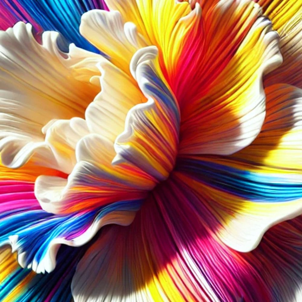 Das Poster zeigt eine atemberaubende Darstellung einer abstrakten Narzisse, deren Blütenblätter in lebendigen Regenbogenfarben leuchten. Diese Blume, inspiriert von einer Narzisse, fängt die Essenz von Frühling und Erneuerung auf faszinierende Weise ein. Die Farben – eine Mischung aus kräftigem Gelb, Rot, Blau, Rosa und Lila – fließen ineinander und erzeugen ein dynamisches und energetisches Bild. Die Blütenblätter sind detailliert und kunstvoll gestaltet, was der Blume ein plastisches und lebendiges Aussehen verleiht. Der dunkle Hintergrund lässt die Farben noch stärker hervortreten und verleiht dem Bild Tiefe und Kontrast.
