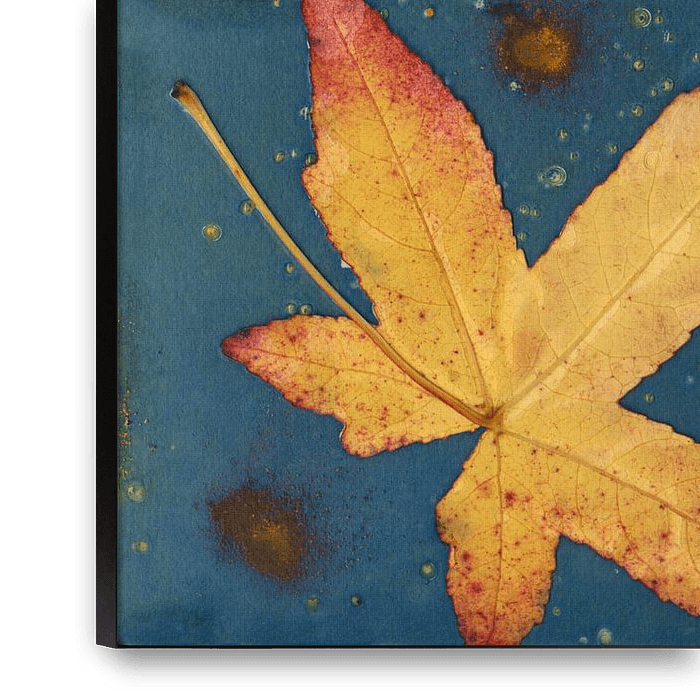 Bestelle diese Collage Nasse Cyanotypie mit buntem Herbstlaub von Retrotimes als Reproduktion auf Leinwand, Alu-Dibond, als Poster, Fototapete oder Acrylglasbild.