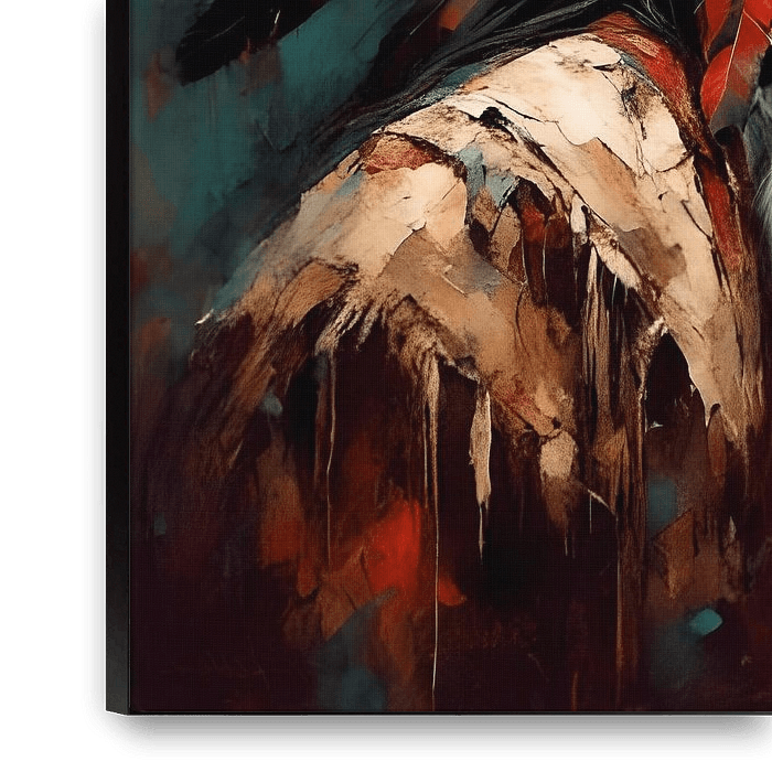 Eine feierliche Person in traditioneller indianischer Tracht, einschließlich eines gefiederten Kopfschmucks, blickt in die Ferne. Satte, warme Farben kontrastieren mit kühlen Hintergrundtönen, um den königlichen und kontemplativen Ausdruck des Motivs hervorzuheben.