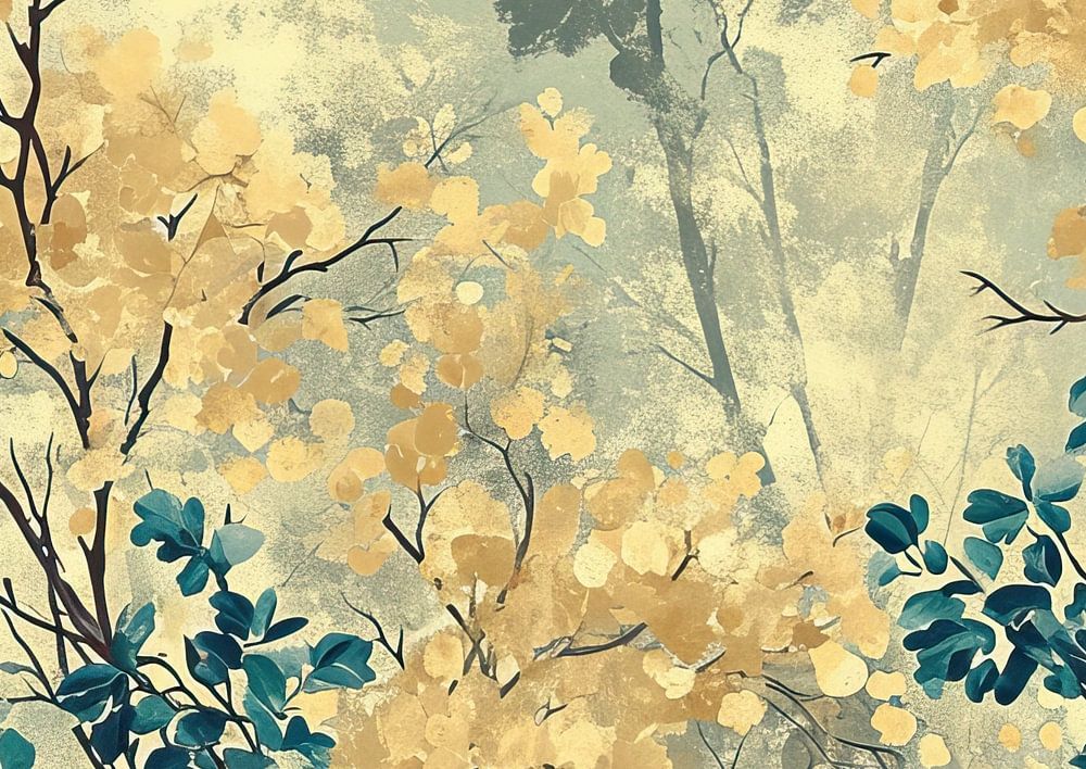 Natural Golden Grace - In diesem Gemälde spiegelt sich die Natur mit einem Zusammenspiel aus goldgelben und tiefblauen Farbtönen wider, die sorgfältig mit subtilen Grautönen zu einer ruhigen und doch lebendigen Komposition vermischt wurden. Die stilisierte Flora sorgt für ein organisches Gefühl, während der Einsatz von Licht und Schatten eine Tiefe erzeugt, die sich mühelos in eine Vielzahl von Einrichtungsstilen einfügt, vom Landhausstil bis zum klassischen Schick.
