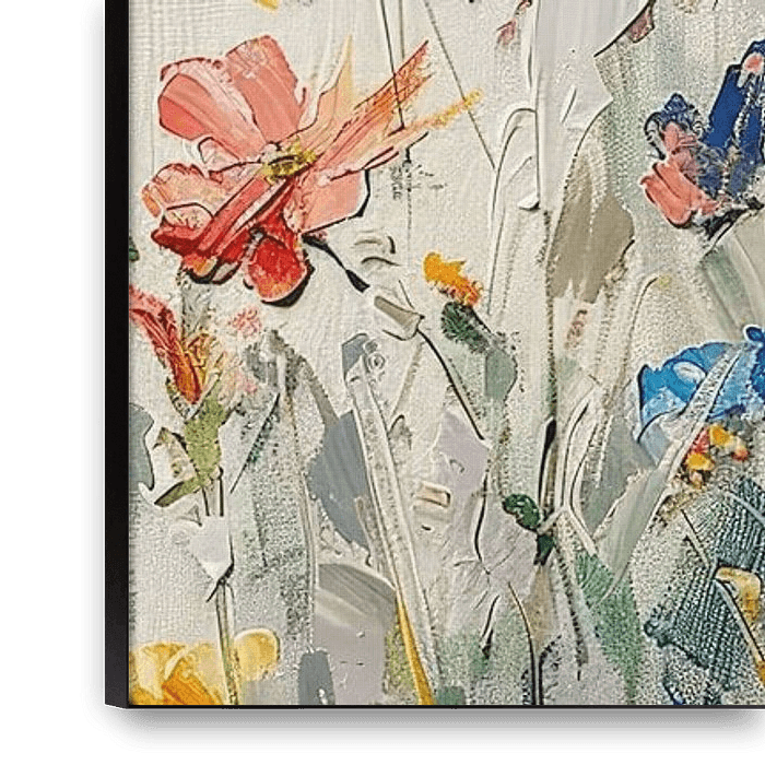 Dieses Gemälde zeigt ein leuchtendes Blumenfeld, reich an Farben und Texturen, das eine sommerliche Atmosphäre hervorruft.