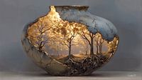 Dieses Gemälde erzählt eine Geschichte von Zerbrechlichkeit und Stärke. Hinter der verwitterten, rissigen Oberfläche eines steinernen Gefäßes verbirgt sich eine Welt: ein majestätischer Baum, der in warmes Sonnenlicht getaucht ist und seine Wurzeln fest verankert, als Symbol für Leben, Wachstum und Widerstandsfähigkeit.