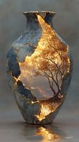 Dieses Gemälde erzählt eine Geschichte von Zerbrechlichkeit und Stärke. Hinter der verwitterten, rissigen Oberfläche eines steinernen Gefäßes verbirgt sich eine Welt: ein majestätischer Baum, der in warmes Sonnenlicht getaucht ist und seine Wurzeln fest verankert, als Symbol für Leben, Wachstum und Widerstandsfähigkeit.