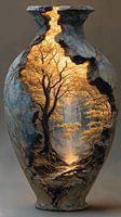 Dieses Gemälde erzählt eine Geschichte von Zerbrechlichkeit und Stärke. Hinter der verwitterten, rissigen Oberfläche eines steinernen Gefäßes verbirgt sich eine Welt: ein majestätischer Baum, der in warmes Sonnenlicht getaucht ist und seine Wurzeln fest verankert, als Symbol für Leben, Wachstum und Widerstandsfähigkeit.
