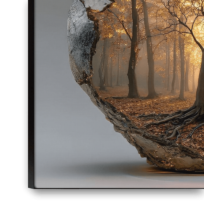 Dieses Gemälde erzählt eine Geschichte von Zerbrechlichkeit und Stärke. Hinter der verwitterten, rissigen Oberfläche eines steinernen Gefäßes verbirgt sich eine Welt: ein majestätischer Baum, der in warmes Sonnenlicht getaucht ist und seine Wurzeln fest verankert, als Symbol für Leben, Wachstum und Widerstandsfähigkeit.