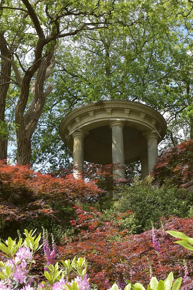 Foto einer natürlichen Landschaft auf dem Landgut Twickel in Delden. Abgebildet ist ein Pavillon inmitten schöner Bäume, die sich vom blauen Himmel abheben. Im Vordergrund verschiedene Pflanzen wie Rhododendron. Farbschema grün, rosa, rot. Naturfotografie.