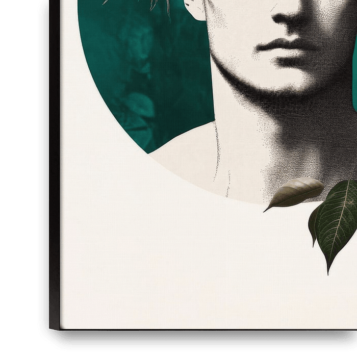 Ein harmonisches Zusammenspiel von Mensch und Natur: Ein jugendlicher Kopf, umrahmt von üppigem Blattwerk und zarten Blüten, strahlt ein Gefühl von Vitalität und Frische aus. Geometrische Elemente fügen eine moderne Note hinzu, während die sanften Grüntöne den Betrachter in eine Welt der Ruhe und des Wachstums entführen. Ein wahrhaft…