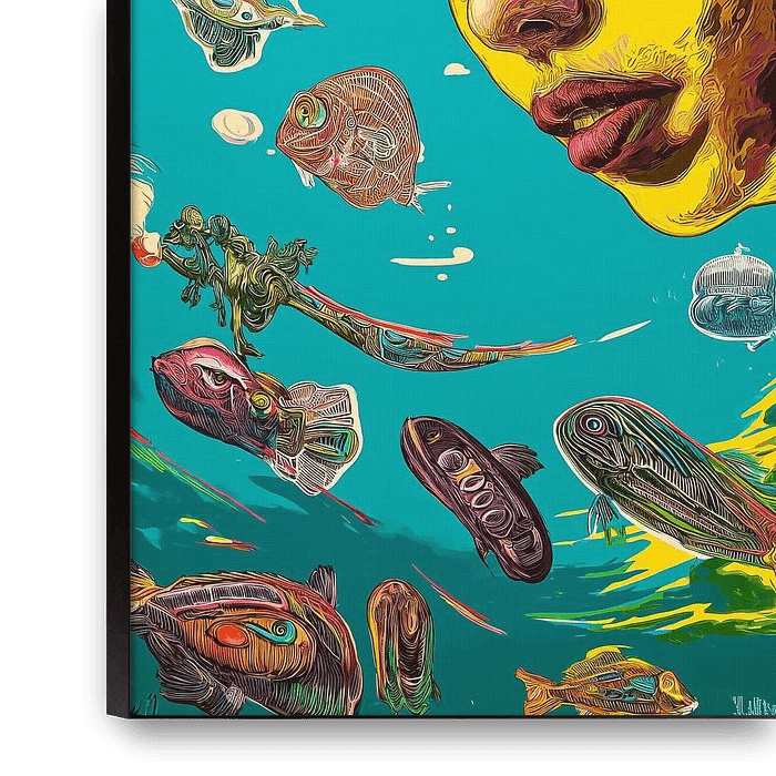 Das digitale Kunstwerk zeigt eine Frau mit langen, spiralförmigen schwarzen Haaren, die am Meer steht. Die Verwendung von heißen Aqua-, Pink- und Gelbtönen erzeugt eine dynamische und energiegeladene Stimmung, während die Einbeziehung grotesker Karikaturen der Szene ein unerwartetes und leicht beunruhigendes Element…