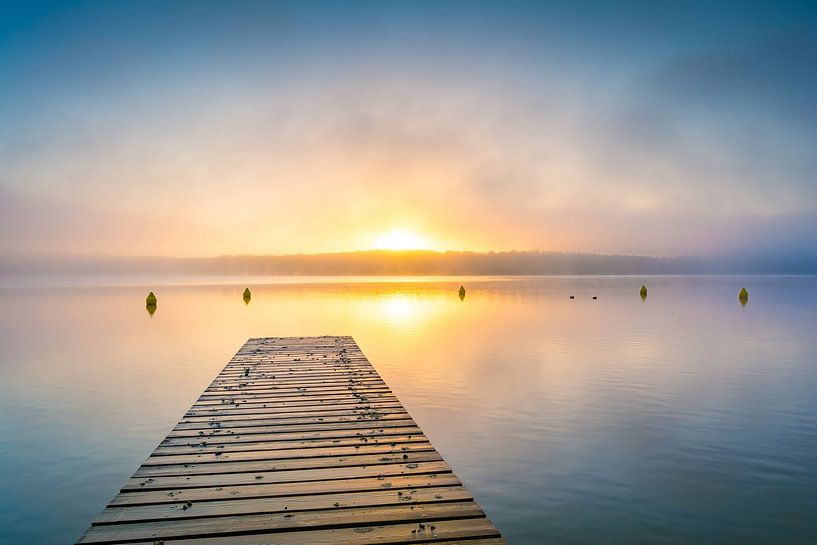 Steg am See im Sonnenaufgang mit Nebel - Mecklenburgische Seenplatte
