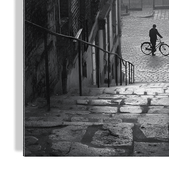 Eine Schwarz-Weiß-Fotografie zeigt eine gepflasterte Treppe, die in eine neblige Straßenszene hinabführt. Ein einzelner Mann in Mantel und Hut steht unten, neben seinem Fahrrad, eingefangen im Zwielicht zwischen den Laternen der alten Stadt. Die feuchten Pflastersteine reflektieren das spärliche Licht, während die kahlen Äste eines…