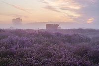 Sonnenaufgang über der lila blühenden Heide in der Nähe von Hilversum, in der einige schottische Hochlandbewohner umherstreifen. Der Nebel trägt zur Schönheit der Szene bei.