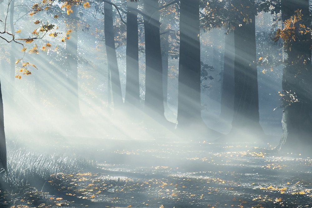 Bestelle das Foto Nebliger Wald mit Sonnenstrahlen und Schatten von Imperial Art House als Reproduktion auf Leinwand, Alu-Dibond, als Poster, Fototapete oder Acrylglasbild.