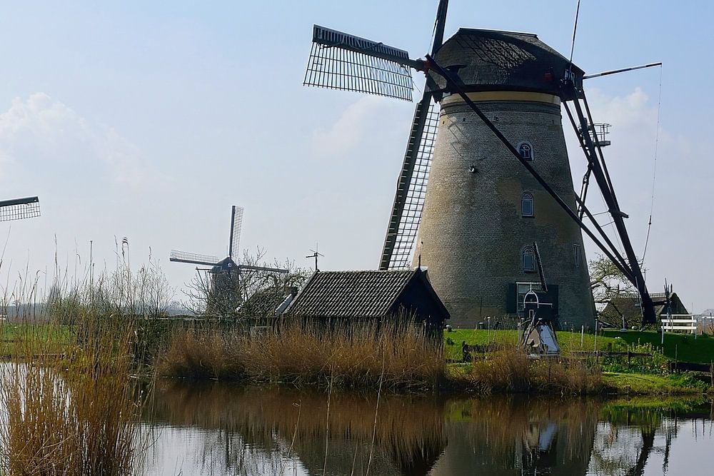 Die Nederwaard-Mühlen Nr. 3 und Nr. 4, beide Teil einer Gruppe von 19 monumentalen Windmühlen in der UNESCO-Welterbestätte in der Nähe des Dorfes Kinderdijk in den Niederlanden.