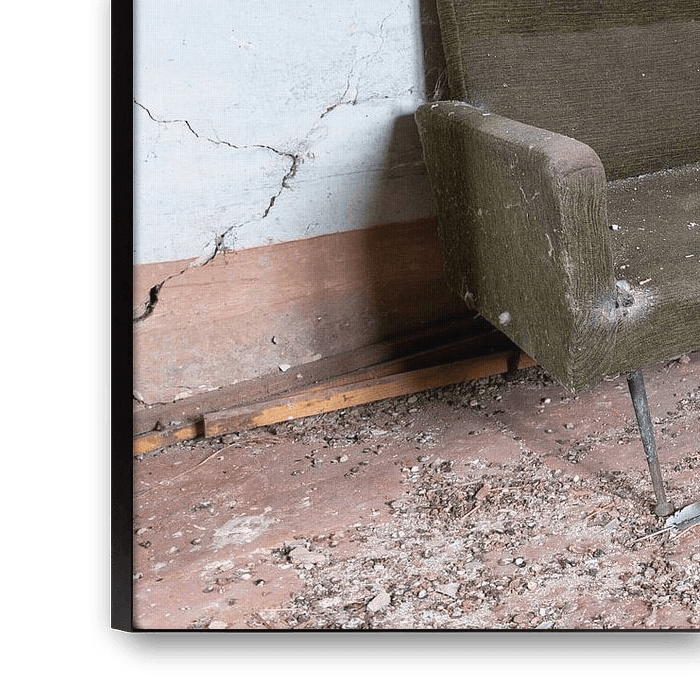 Sofa in einem verlassenen Wohnzimmer in einem verlassenen Haus in der Toskana, Italien. urbex