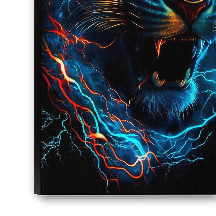 Ein wilder Jaguar, umhüllt von elektrisch blauen und leuchtend orangen Blitzen. Seine glühenden Augen und scharfen Reißzähne strahlen rohe, ungezähmte Kraft und ursprüngliche Energie aus.