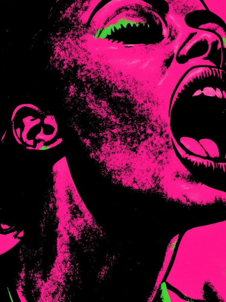 Dieses explosive digitale Kunstwerk strotzt nur so vor Energie und Kraft. Das schreiende Gesicht der Frau, das in leuchtendes Pink und Neongrün gehüllt ist, scheint inmitten eines visuellen Ausbruchs gefangen zu sein. Die groben, spritzenden Linien, die aus ihrem Körper und ihren Haaren zu schießen scheinen, verstärken das Gefühl von Bewegung und intensiven Emotionen. Der Kontrast zwischen dem tiefschwarzen Hintergrund und den fluoreszierenden Farben macht dieses Werk fast elektrisch geladen. Der Stil kombiniert klassische Pop-Art mit einer punkigen, rohen Ästhetik, die an die lebhaften Underground-Poster der 1980er Jahre erinnert. Die körnigen Texturen und die Spritzer von Neonpigmenten verleihen dem Werk einen dynamischen Street-Art-Charakter. Die Ausdruckskraft des Schreis ist greifbar, als ob die Energie buchstäblich aus dem Bild heraus explodiert und den Betrachter umgibt... Dieses Werk ist eine perfekte Ergänzung für moderne Innenräume, kreative Arbeitsbereiche oder Räume mit einem mutigen, urbanen Flair. Ein echter Blickfang, der sofort die Aufmerksamkeit auf sich zieht und die Grenze zwischen Kunst und visueller Explosion überschreitet. Ideal für Liebhaber ausdrucksstarker und rebellischer Kunst mit einem energiegeladenen Look.