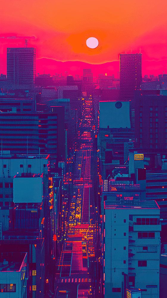 Dieses Bild zeigt eine urbane Landschaft während eines Sonnenuntergangs, mit einer farbenfrohen und lebendigen Neon-Ästhetik. Dieses digital erzeugte Bild vermittelt den Eindruck einer mit intensiven Farben bearbeiteten Fotografie. Der Himmel ist eine Mischung aus leuchtenden Pink- und Orangetönen, während die Stadt darunter von kühlen Blau- und Violetttönen dominiert wird. Die Straßen werden von den Lichtern der Autos und Gebäude erhellt, wodurch eine dynamische und energiegeladene Atmosphäre entsteht. Die Sonne in der Mitte der Komposition zieht die Aufmerksamkeit auf sich und verleiht der Szene ein Gefühl von Wärme und Fokus.