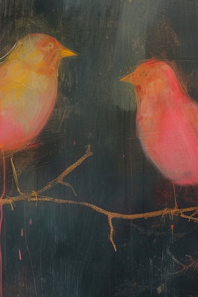 Details: Vögel, abstrakt, Neon, Zweig, Malerei, modern, Kunst, schwarz, rot, gelb