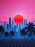 Eine abstrakte Neonlandschaft mit einer silhouettierten Stadtlandschaft unter einem großen Mond und Palmen.