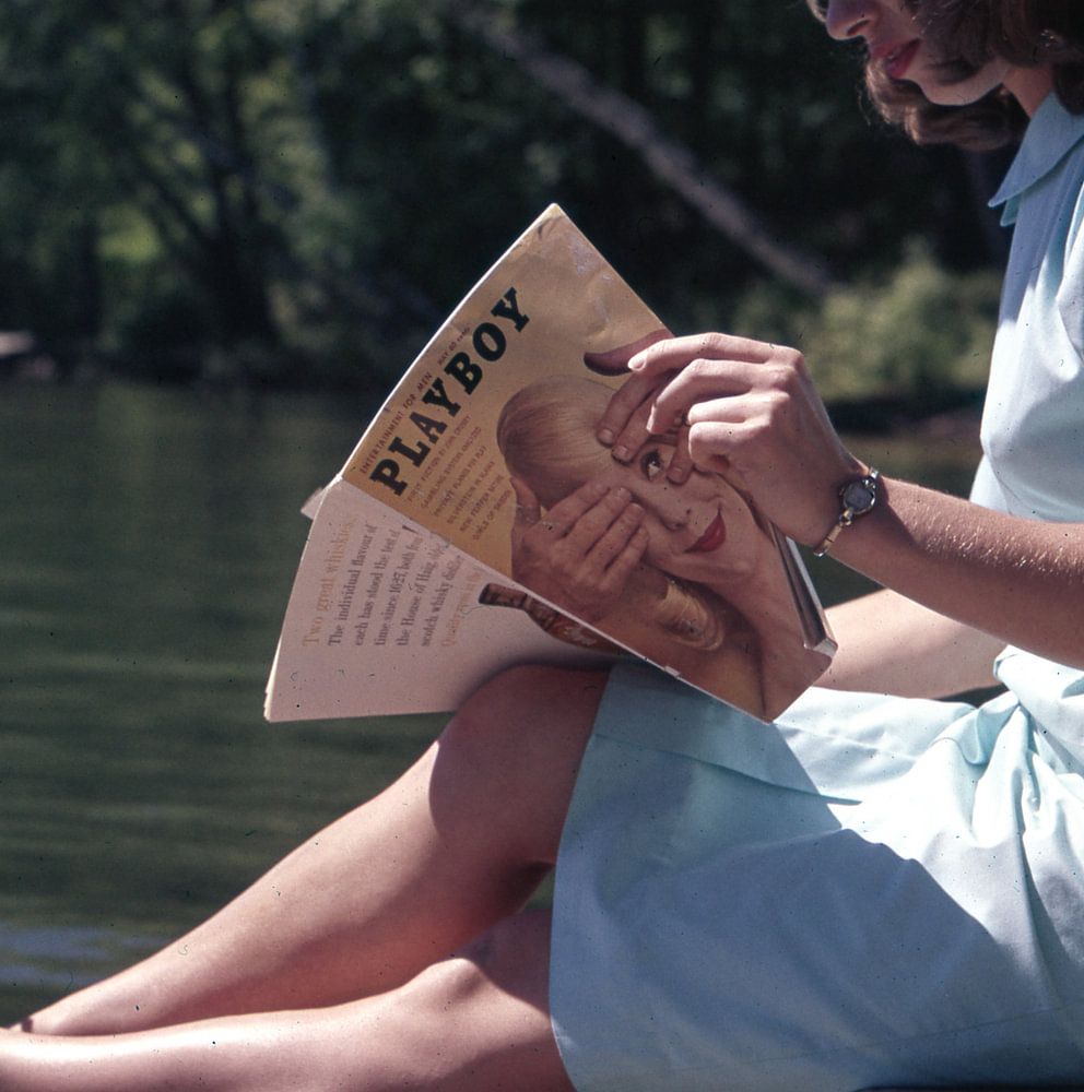 Lesen Sie das 50er-Jahre-Modell auf einem Gerüst im Play Boy! Foto vom alten Dia und sehr schön für an der Wand z.B. auf Leinwand oder gerahmt