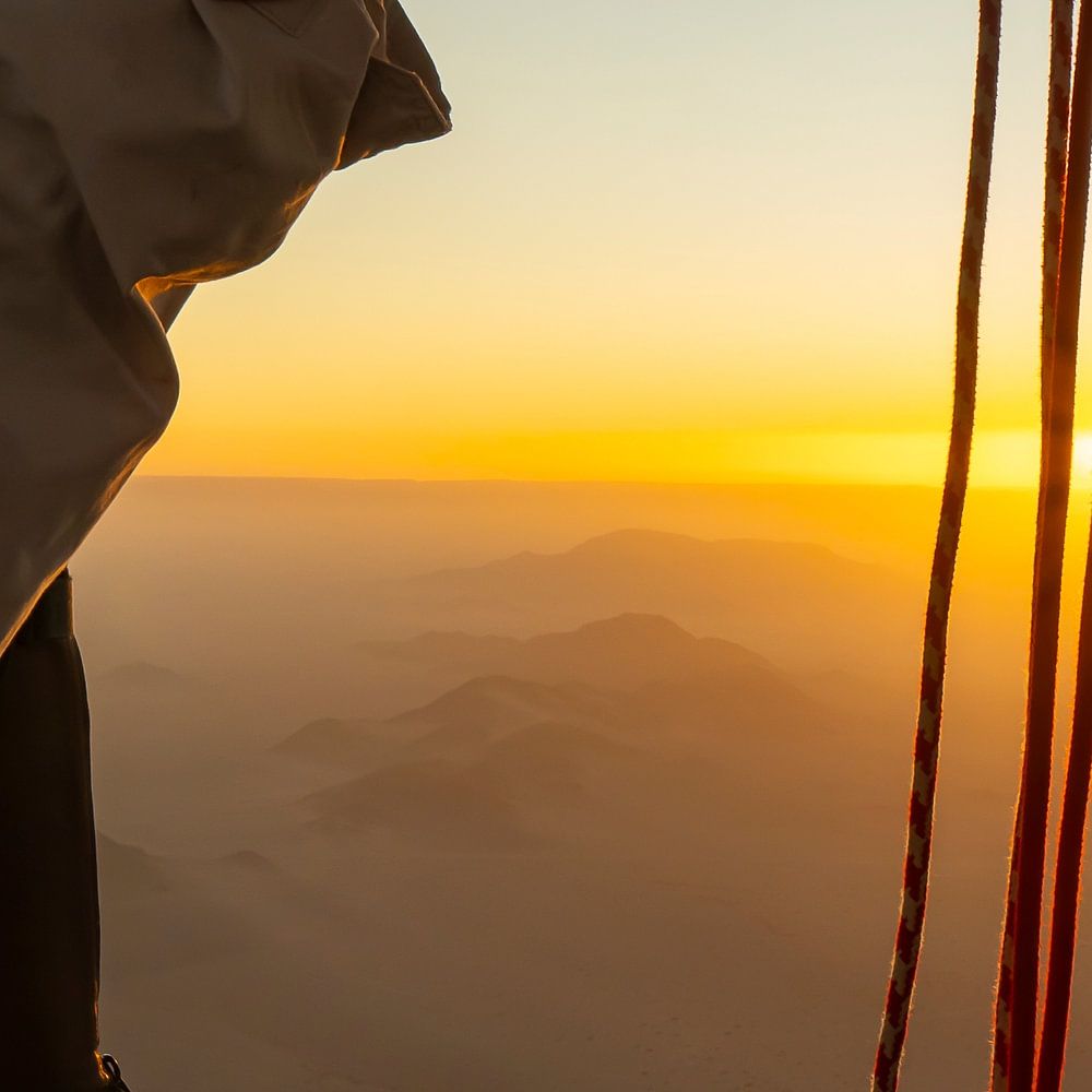 Die aufgehende Sonne in der Namibwüste vom Heißluftballon aus. Ein neuer Anfang und ein fantastischer Start in den Tag.