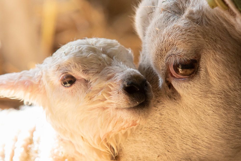 Das neugeborene Lamm wird von der Mutter im Stall im Stroh versorgt. Die Sonne scheint wunderschön im Stall.