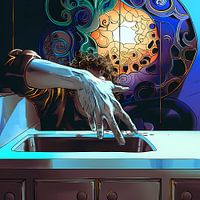 In einer fesselnden Szene, in der Fantasie und Neugierde miteinander verschmelzen, streckt eine Gestalt mit weißer Haut und lockigem Haar ihre Hand unter einer eleganten, modernen Theke hervor und greift behutsam nach einem polierten Waschbecken. Der lebhafte Hintergrund, geprägt von filigranen Mustern und kräftigen Farben, verstärkt…