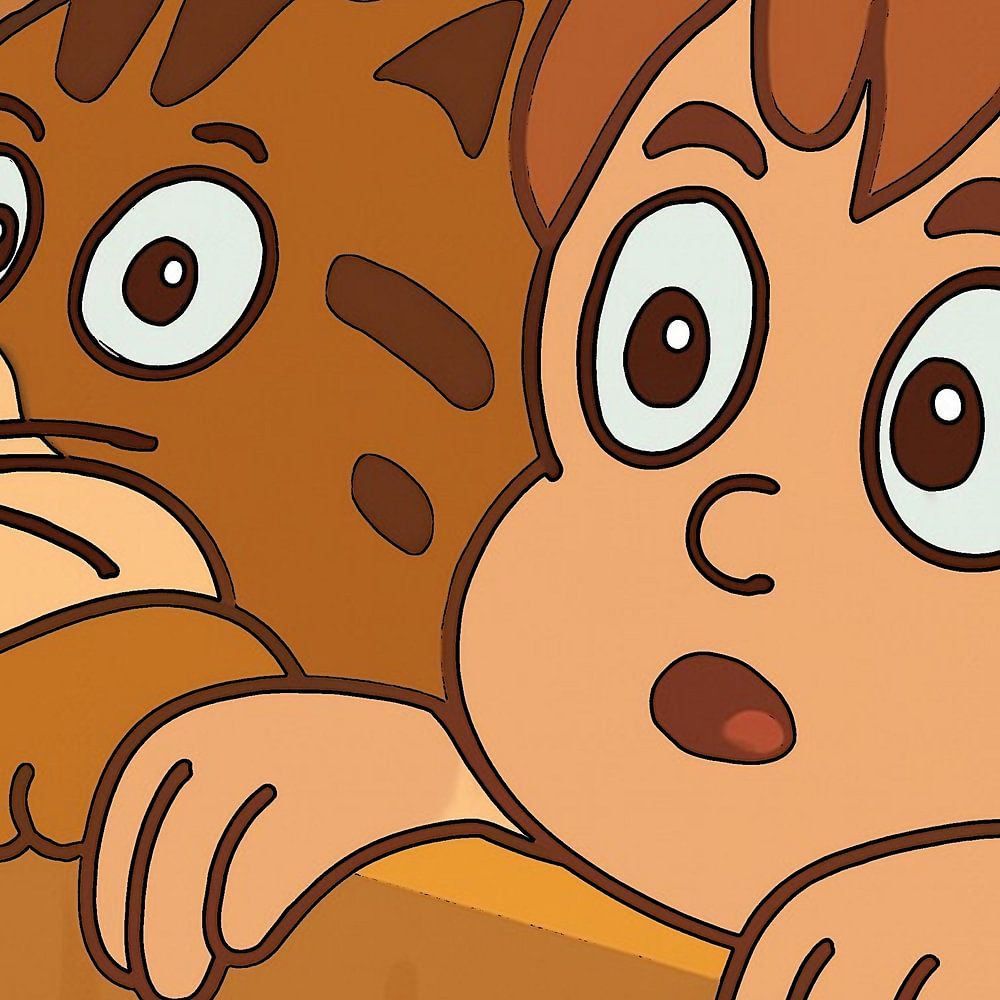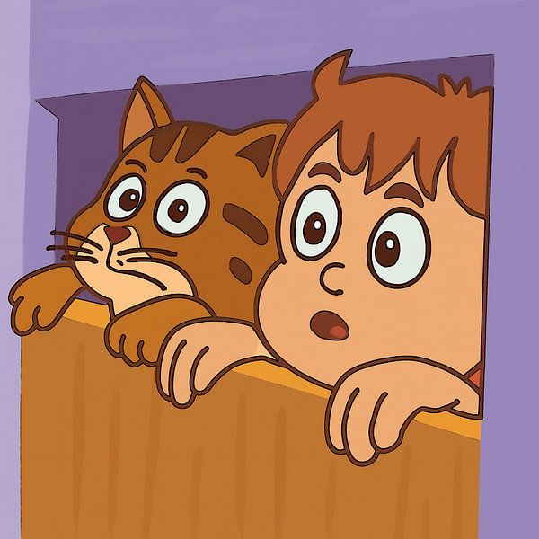 Ein Kind und eine Katze schauen gemeinsam neugierig über eine Holzleiste, als würden sie außerhalb des Bildausschnitts etwas Überraschendes oder Spannendes entdecken. Der gemeinsame Ausdruck von Staunen und Verwunderung verleiht der Illustration eine verspielte und herzliche Atmosphäre, in der Mensch und Tier dieselbe Emotion teilen.