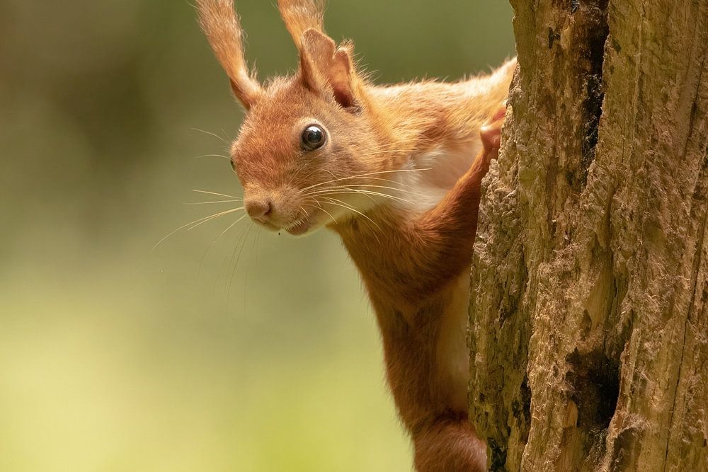 Dieses Eichhörnchen schaut neugierig um die Ecke des Baumstammes.