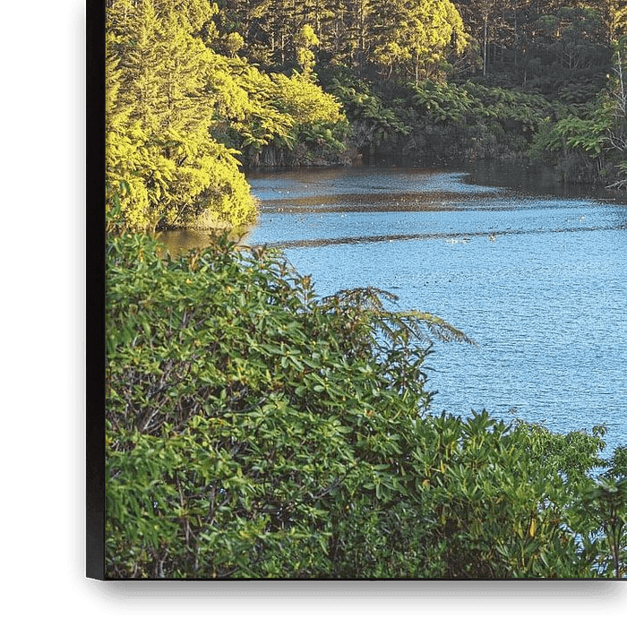 Ein bezauberndes Bild, das die ruhige Anmut des Lake Mangamahoe einfängt, während sich der majestätische Mount Taranaki im Hintergrund erhebt. Dieses Panorama bietet einen fesselnden Blick auf die malerische Symbiose von Berg und See in Neuseeland