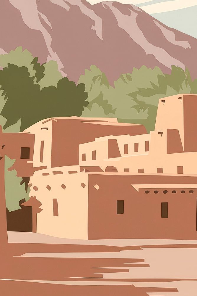 Sanfte Erdtöne umarmen die majestätischen Berge und traditionellen Adobe-Gebäude, während der Himmel in weichen Pastellfarben schimmert. Diese harmonische Komposition strahlt Ruhe und eine gewisse Mystik aus, perfekt geeignet für das Wohnzimmer, wo sie einen entspannenden Rückzugsort schafft und die Gäste in die faszinierende Landschaft New Mexicos entführt.