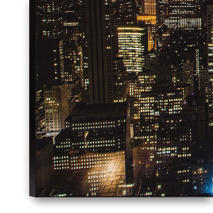 Eine Nachtaufnahme der Wolkenkratzer in New York, wobei verschiedene Gebäude mit unterschiedlichen Lichtfarben beleuchtet werden