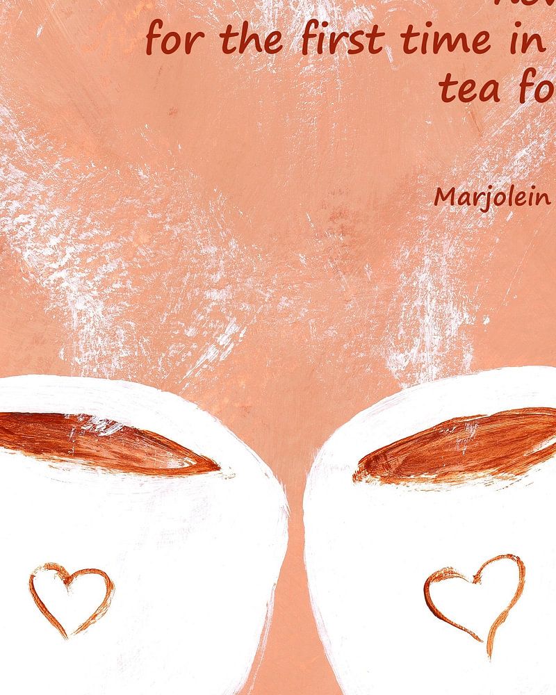 „Tea for Two“ ist ein Acrylgemälde in zeitgenössischem quadratischen Format handgemalt von der Künstlerin Karen Kaspar. Es zeigt zwei weiße Tassen auf einem abstrakten Schokoladenfarbenen Hintergrund. Die Tassen sind mit kleinen Herzen verziert, einander zugeneigt und der Dampf des heißen Tees bildet eine Herzform. Die Tassen können jedoch genausogut mit Kaffee, Espresso oder Mocha gefüllt sein für ein gemeinsames Kaffeekränzchen. Für die Liebhaber von süßer Schokolade fülle ich die Tässchen mit leckerer heißer Schokolade.