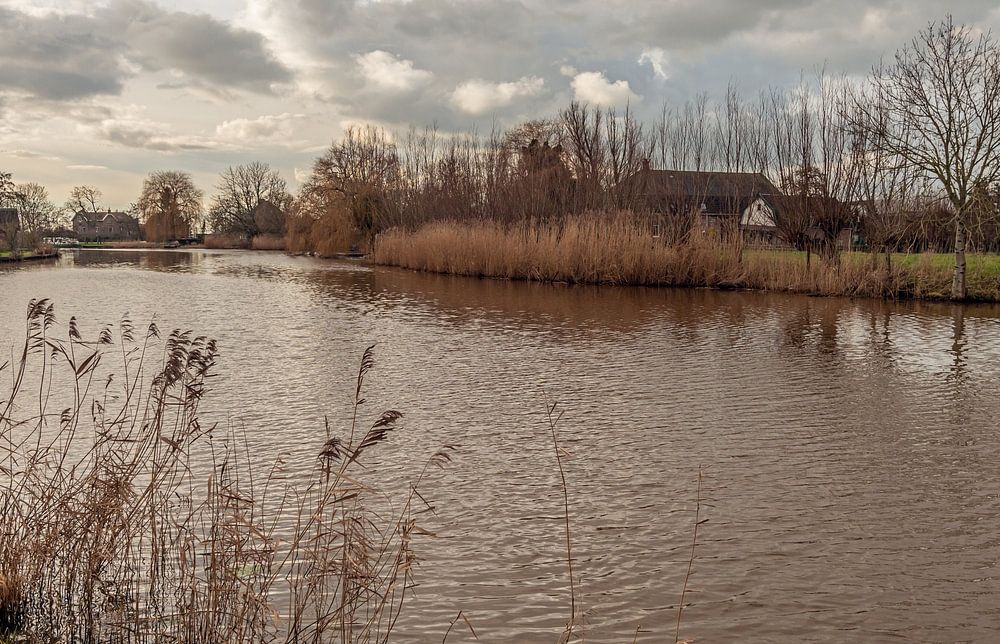 Malerische Landschaft mit dem Fluss Giessen in der Nähe des niederländischen Dorfes Giessenburg, Gemeinde Molenlanden im Alblasserwaard, Provinz Südholland. Das Foto wurde an einem bewölkten Tag in der Wintersaison aufgenommen.