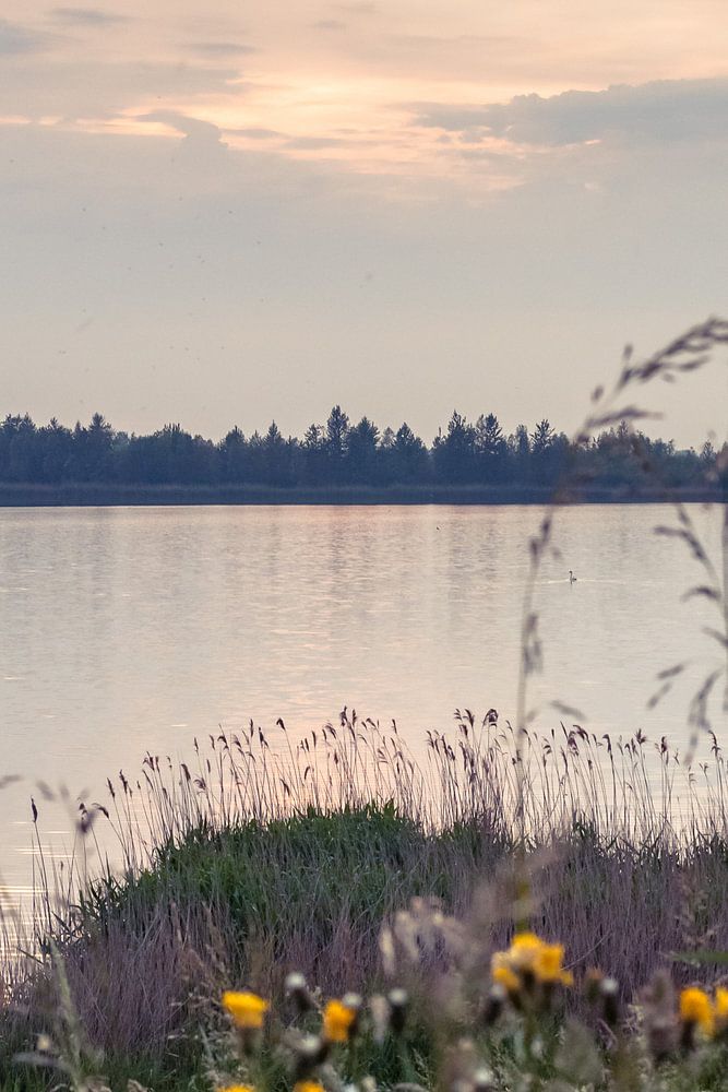 Sonnenuntergang über holländischen Gewässern. Die Ränder der Deiche sind noch voller Feldblumen und hohem Gras und das Wasser liegt dort still wie ein Spiegel.