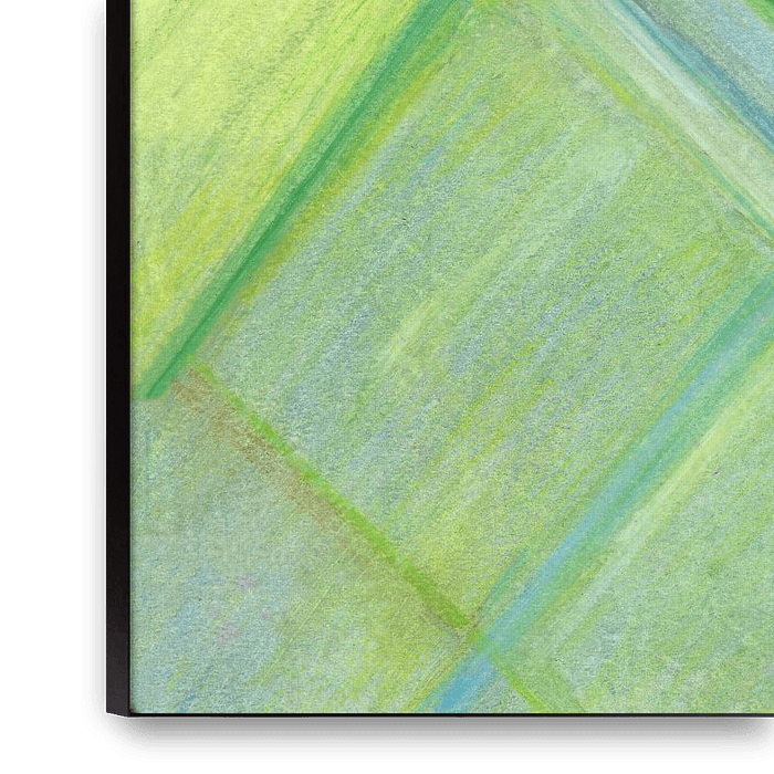 Holland, mein Heimatland. Holland aus der Luft gesehen mit seinen geraden Gräben, den gelbgrünen Maisfeldern. Ein Land, das ich liebe. Hier habe ich mit Ölpastell gemalt, um es ein bisschen romantisch zu machen, mit sanften Farben, ohne diese wirklich engen Linien. Es sieht aus wie ein Gemälde von Mondrian, aber er hat hier enge…