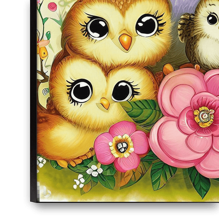 Bestelle das digitale Kunst Bild Niedliche Eulen und Blumen von Laly Laura als Reproduktion auf Leinwand, Alu-Dibond, als Poster, Fototapete oder Acrylglasbild.