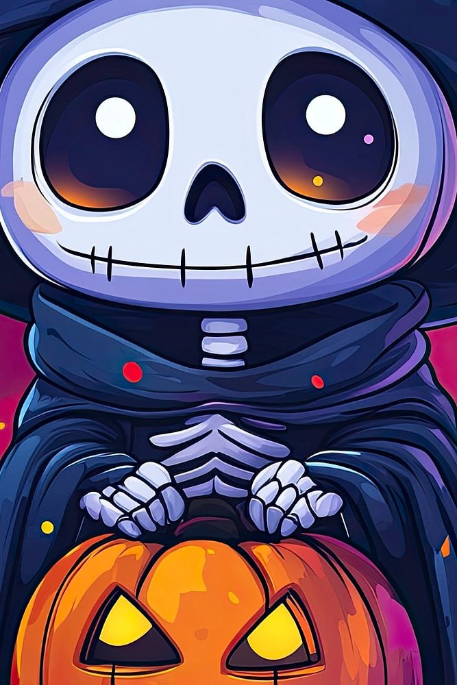 Ein Cartoon-Skelett mit blau-lila Hexenhut und -gewand hält einen Laterneneimer. Das Skelett hat leuchtende orangefarbene Augen und ein aufgesetztes Lächeln, was ihm ein verspieltes und leicht gruseliges Aussehen verleiht. Der Hintergrund ist eine lebendige Mischung aus orangefarbenen, rosa und lila Aquarellspritzern, die eine skurrile und festliche Atmosphäre schaffen.