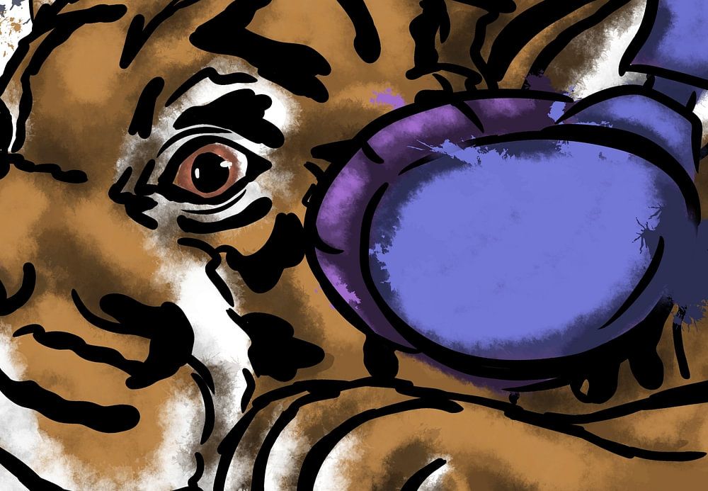 Ein stilisierter Tiger mit skurrilem Gesichtsausdruck trägt lila Kopfhörer. Der Tiger stützt seinen Kopf auf seine Pfoten, was seiner Haltung eine anthropomorphe Qualität verleiht, während er Musik zu hören scheint.