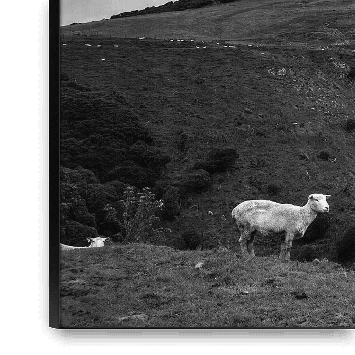 Zwart wit foto van een Nieuw Zeelands schaap met op de achtergrond het lokale landschap vol met zijn soortgenoten.