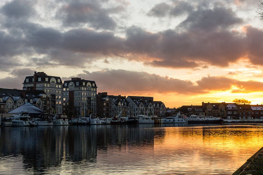 Een zonsondergang over de Nieuwe Kaai van Turnhout tijdens de stadswandeling "Turnhout by Night 2015".
