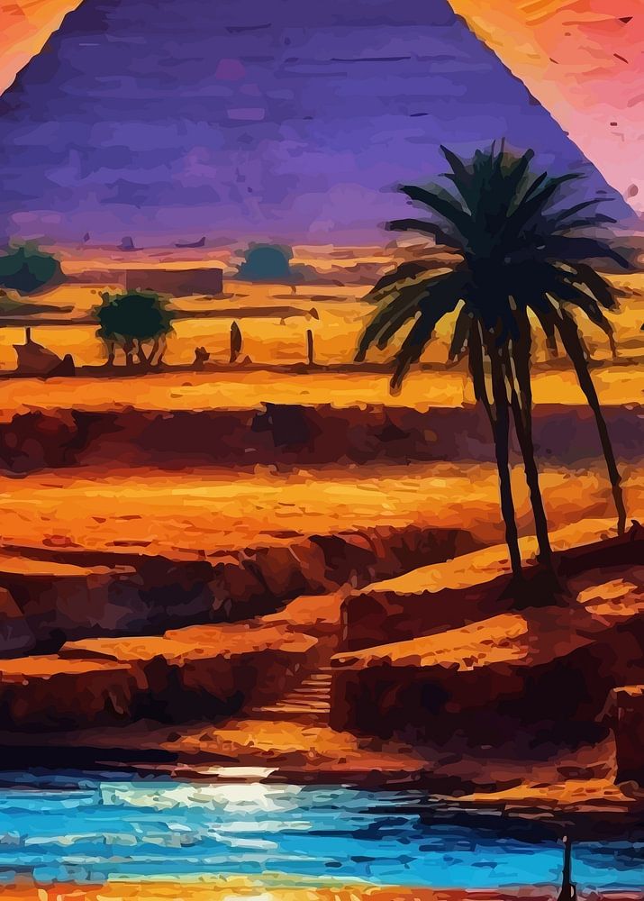 Eine bezaubernde Ölpastell-Szene des Nils bei Sonnenuntergang, mit einem traditionellen Fischerschiff, das sanft auf dem ruhigen Wasser treibt. Im Hintergrund erheben sich die ikonischen Pyramiden von Gizeh vor dem leuchtend orangen und violetten Himmel. Die weichen, strukturierten Pinselstriche der Ölpastelle fangen das warme, goldene Licht ein, das sich auf der Oberfläche des Flusses spiegelt, während die Silhouetten des Schiffes und der Pyramiden der Szene eine zeitlose, geheimnisvolle Note verleihen. Die ruhige und doch ehrfurchtgebietende Atmosphäre erinnert an die alten Wunder Ägyptens am Ende des Tages.