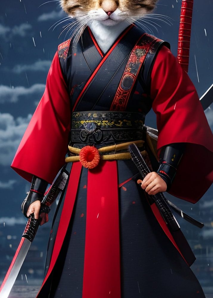 Bestelle das digitale Kunst Bild Ninja-Katze von Muhammad Yunus als Reproduktion auf Leinwand, Alu-Dibond, als Poster, Fototapete oder Acrylglasbild.