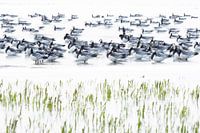 Nonnengänse mit den Beinen im Wasser, bereit zur Abreise nach Sonnenaufgang